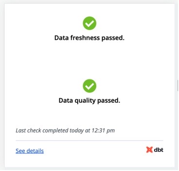 - Data health status: Data freshness passed, Data quality passed, Data may be stale, Data quality degraded